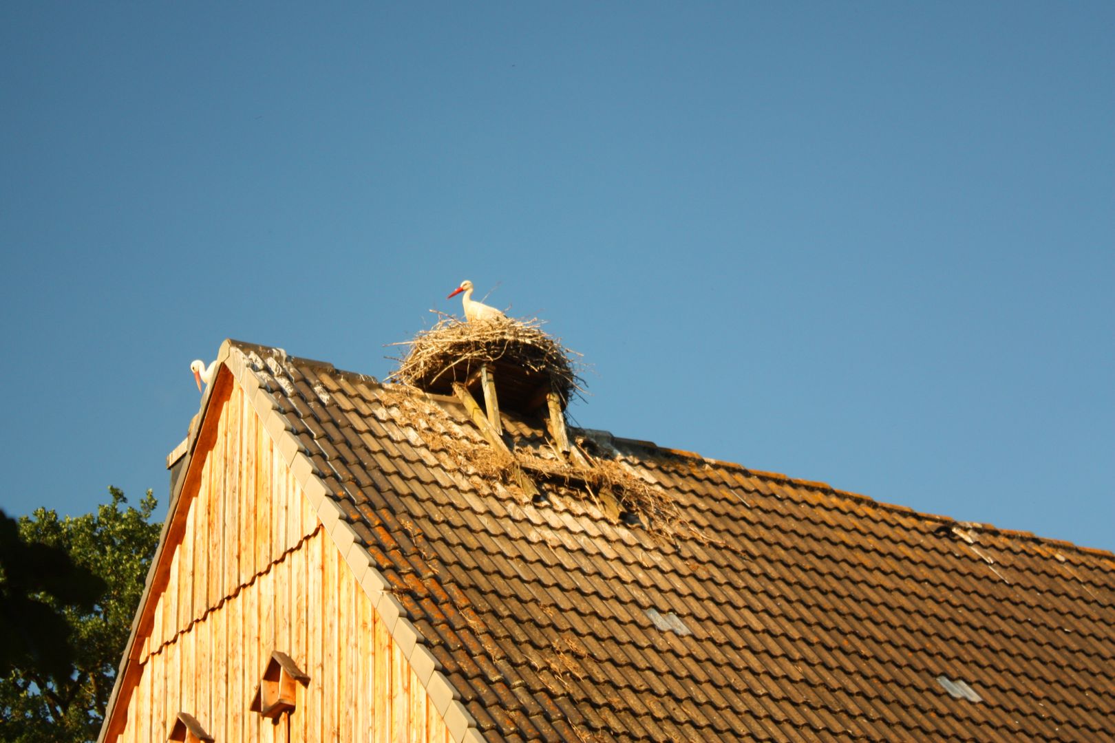 Um dem Insektensterben entgegenzuwirken haben wir auf der Hofanlage im Rahmen der Aktion „Bunte Meter“ des NABU eine Insektenwiese am Rande des Bachlaufs angelegt. Altes Mauerwerk, Steinhaufen, Totholz und Ställe mit Mist und Stroh schaffen Lebensraum für verschiedensten Insekten und anderes Getier. Auf unserer Ackerfläche wachsen in wechselnder Fruchtfolge Getreide und Kleegras mit Wildpflanzen wie Mohn oder Kornblumen, die Bienen und Schmetterlingen Nahrung bieten. Unter den Scheundendächern haben unterschiedliche Fledermausarten, wie der Große Abendsegler und das Kleine Mausohr, Schutz gefunden, während auf dem Dach Storchenpaare nisten.